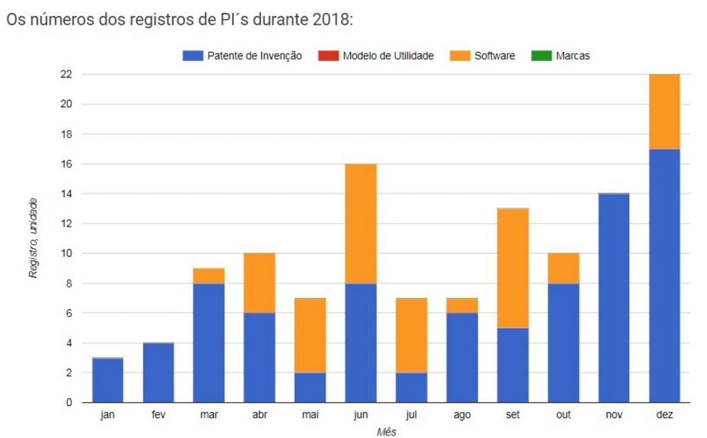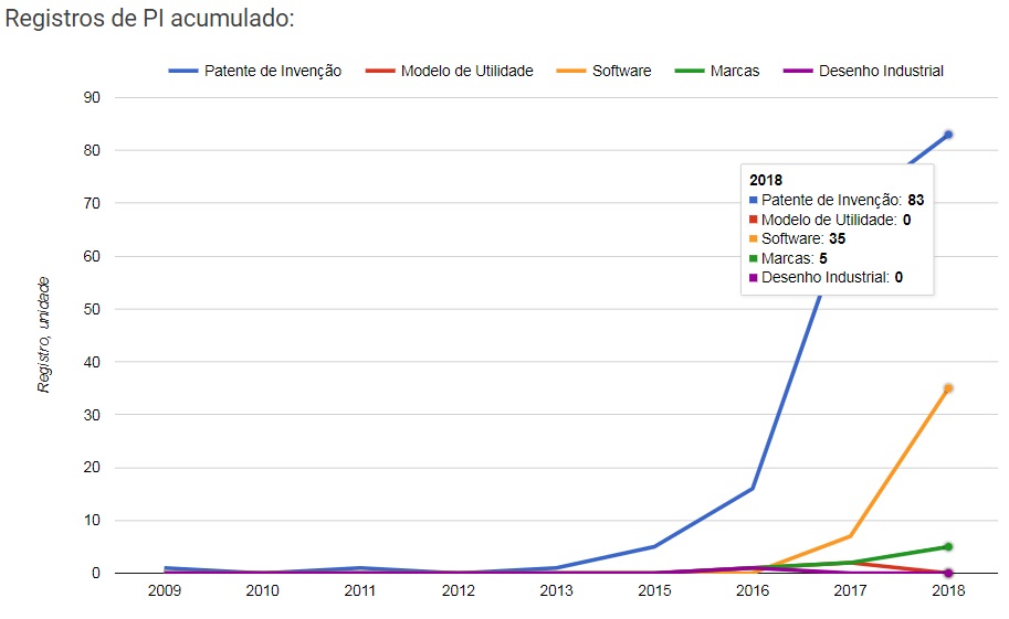 Se em 2017 o NITT auxiliou o registro de 80 patentes, em 2018 esse número subiu para 83. Os registros, de uma forma geral, estão distribuídos da seguintes forma: 83 patentes de invenção, 35 de softwares e 5 de marcas.