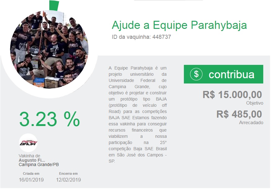 Alunos da Universidade Federal de Campina Grande e integrantes da Equipe Parahybaja estão precisando da sua ajuda. É que o grupo embarca no final deste mês para a 25ª Competição Baja SAE Brasil, o Nacional da categoria, principal disputa do País. No entanto, a equipe, que tem todos os membros voluntários, enfrenta diversos obstáculos, desde estadia e transporte a obtenção de equipamentos de manutenção e outros essenciais à participação no evento.