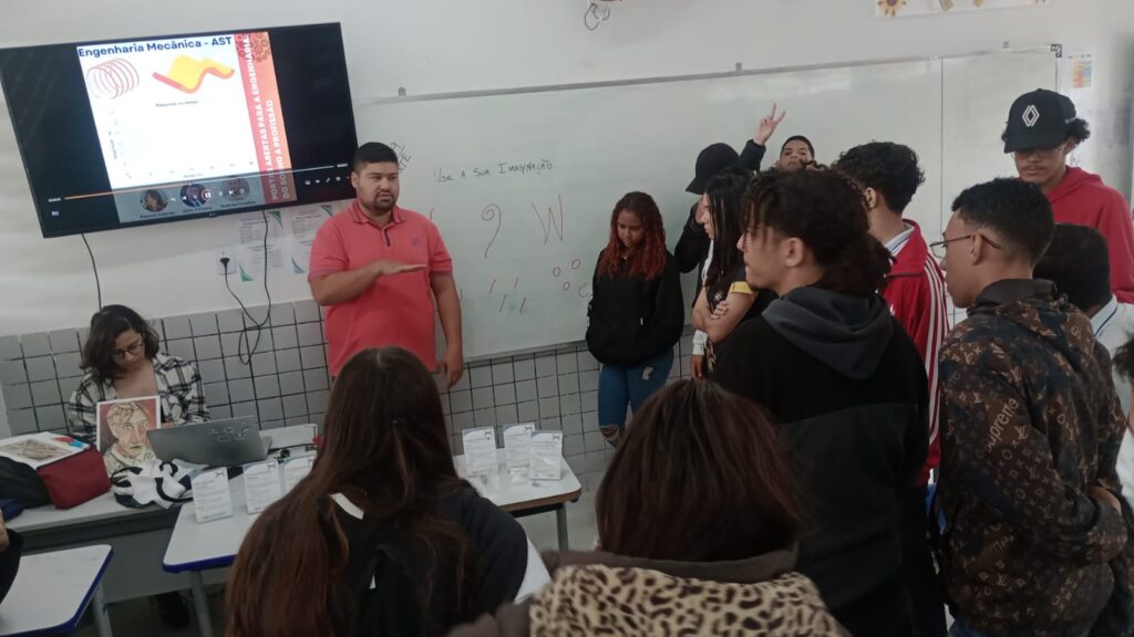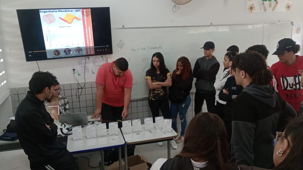 O novo ciclo de palestras do Programa de Extensão “Portas Abertas para a Engenharia: Do Sonho à Profissão”, sob coordenação do prof. Gabriel de Castro Coêlho, da Unidade Acadêmica de Engenharia Mecânica (UAEM), e aprovado e fomentado pelo Edital Nº PROBEX 002-2025, iniciou-se no dia 02/09/2025, com palestra aos alunos do ensino médio da Escola Estadual Edvaldo do Ó (Estadual de Bodocongó). A palestra, intitulada “Pós-Graduação em Engenharia Mecânica: Um Link entre Engenharia e Ciência” foi conduzida pelo aluno extensionista Júlio Feitosa da Silva Neto, que também é aluno de mestrado no Programa de Pós-Graduação em Engenharia Mecânica (PPGEM) da UFCG, desenvolvendo dissertação de mestrado no Laboratório Multidisciplinar de Materiais e Estruturas Ativas (LaMMEA). Na ocasião, e com apoio da aluna de graduação em Engenharia Mecânica, Raquel Almeida Calado, foram feitas demonstrações de experimentos que refletem algumas das linhas de pesquisas do PPGEM.